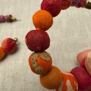 Lovely hoop earrings made from Indian textile cloth beads! Purchased in Asheville on a trip but never worn. About 1.5 inches long. Light and beautiful, very unique! Little gold bead at end of hoop.