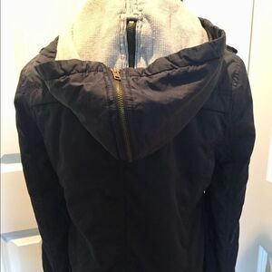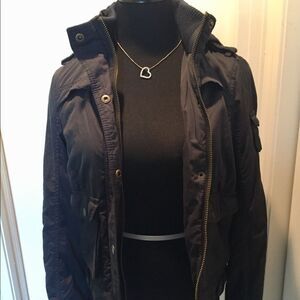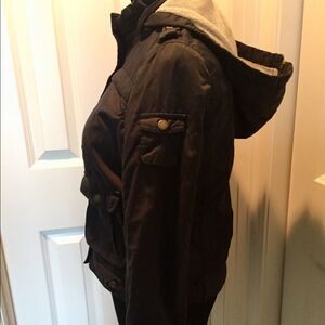 Cute light jacket by American Eagle Outfitters in size medium. It runs small . 2 pockets in front and 1 on the left arm. The hoody can be zipped open or removed . Shell is a mixture of cotton and nylon.
