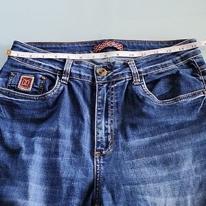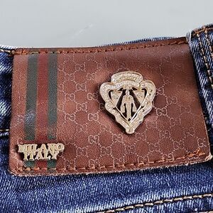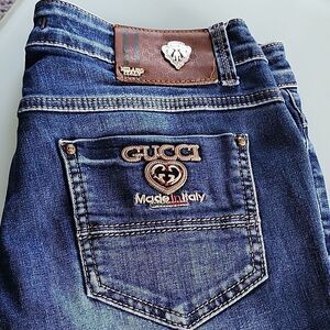 These are high waisted, and super cute. I can't confirm that they're authentic Gucci, so I'm not branding them as Gucci, but they're sure cute! They have an 11" rise, a 34" waist, and a 31" inseam, and they have stretch. EUC. B75.5221