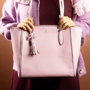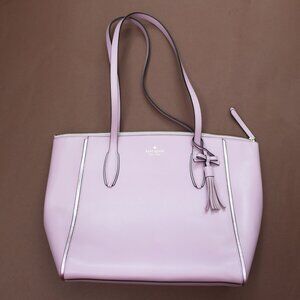 Meet this adorable lavender leather tote bag from Kate Spade, a delightful fusion of playful charm and practicality. Crafted from durable leather, it features a secure zipper closure and an inner pocket. Compact yet spacious, measuring 11" H x 15" L x 5" D, this bag arrives gently used.