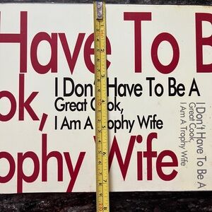 Metal sign proclaims “I don’t have to be a great cook; I am a trophy wife.” Two sawtooth hangers on back. Measures approximately 7.25” x 18.75”.