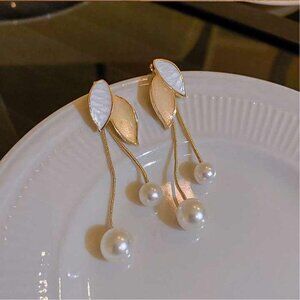 Cute Korean Style Faux Pearl & Leaf Tassel Earrings Long Tassel Drop Earrings.