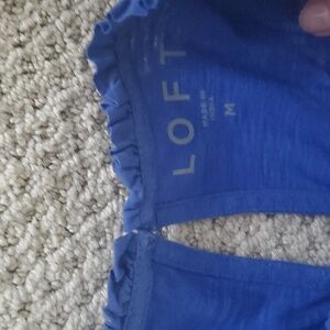 royal blue, beautiful lace detail. ruffle sleeve. cotton, cute for summer and then could wear into fall. one button closure in back at neck. barely worn