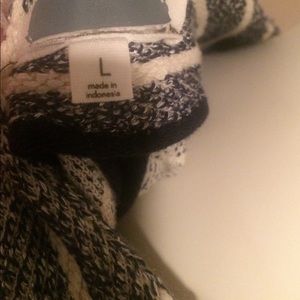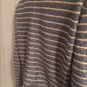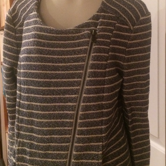 Super Comfy and cute size large loft gray and white horizontal striped light jacket with a slight angle front zipper and 2 front pockets.