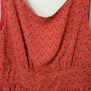 This is a fun summer dress. It is fully lined. Sleeveless. Short dress. It is an orangey red with blue and black flower type decoration. It measures lying flat: bust = 16.5 inches, waist = 14 inches and overall length is 36.5 inches from shoulder seam to bottom hem. Side seam pockets. Zip back closure. Great condition. Smoke free, pet friendly home.