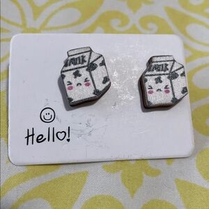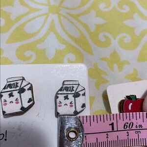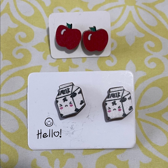 -Adorable earrings set featuring milk carton and apple designs. Perfect for adding a playful touch to any outfit.