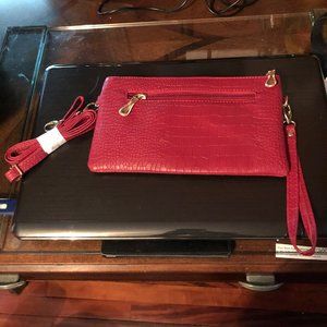 This purse has the option of carrying it as a cross body bag or as as wristlet. There are two zippered compartments; one inside and one outside under the flap. Measurements are 9 1/2" x 6". Excellent condition; like new.