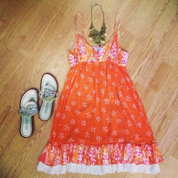 Multi color sundress, knee length, adjustable straps, ruffles on the bottom. Size: Small. Materials: 100% cotton