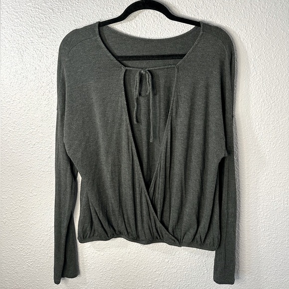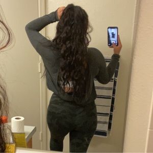 This cute top has an open back and is cinched at the bottom. It has an open back that can be adjusted with strings. Super cute and very comfortable for the gym!