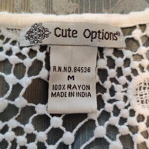 Cute Options white swimsuit cover-up with lace accents, VG used condition, size M. 100% rayon. 12" strap to strap, 21" pit to pit, 35" length.