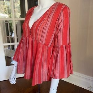 There are no labels or tags on this top. It’s very cute, BoHo style with three-quarter sleeves in shades of orange and coral. It fits a size small or medium and is in good preowned condition.