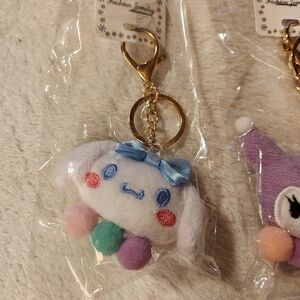 Adorable plush sanrio inspired keychains featuring a white and purple character design. Each keychain has gold accents and a playful look.