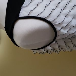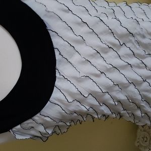 This sweet ruffled top is fashioned from black and white light weight stretch polyester knit. Scoop neck in front.