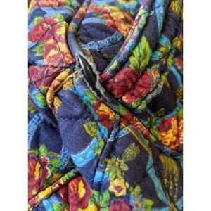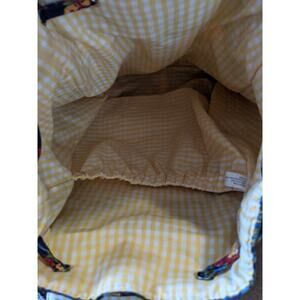 This is a Cute Quilted Fabric Drawstring Backpack Purse in a Colorful Floral Pattern with Yellow Gingham Lining. It has 2 Open Side Pockets - perfect for cellphones. In good pre-owned condition, with the exception of wear to the bottom corner trim. Please see pics for details.