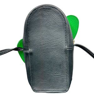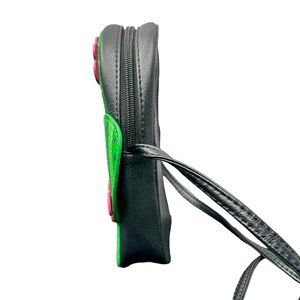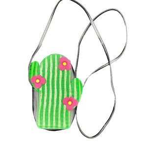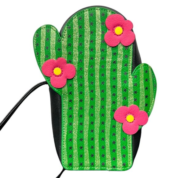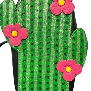 This quirky little crossbody features a green and black glittered saguaro cactus with pink and yellow cactus blossom. The bag itself is black with an affixed strap.The small size is perfect for toting just the essentials.