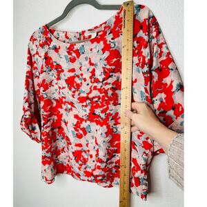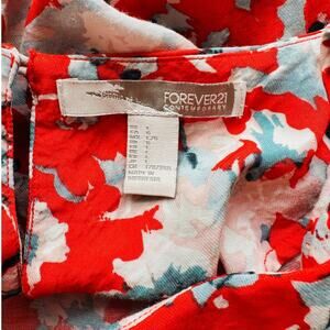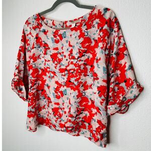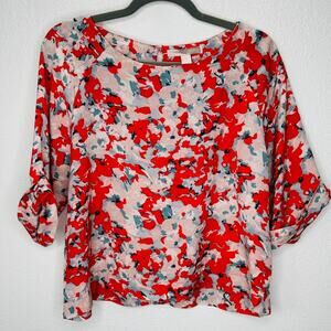 Forever 21 Cute Red Pink Blue Floral 3/4 Cuffed Sleeves Wide Round Neck Blouse Top