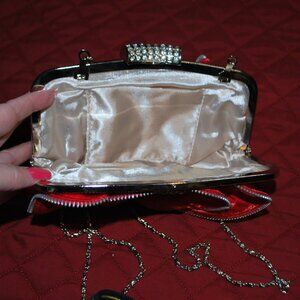 This unique red purse features ruffles edged along in a silver zipper detail. Front features four rows of sparkly crystals as does the amazing closure. Long silver chain strap is removable or can be tucked inside. Interior has one slip pocket. This one is perfect for those special occasions where you don't want to carry a large purse.