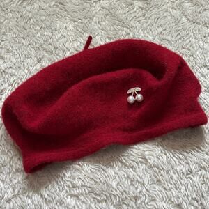 Cute Red Wool Beret with Cherry Rhinestone Pin Chic Fall Winter