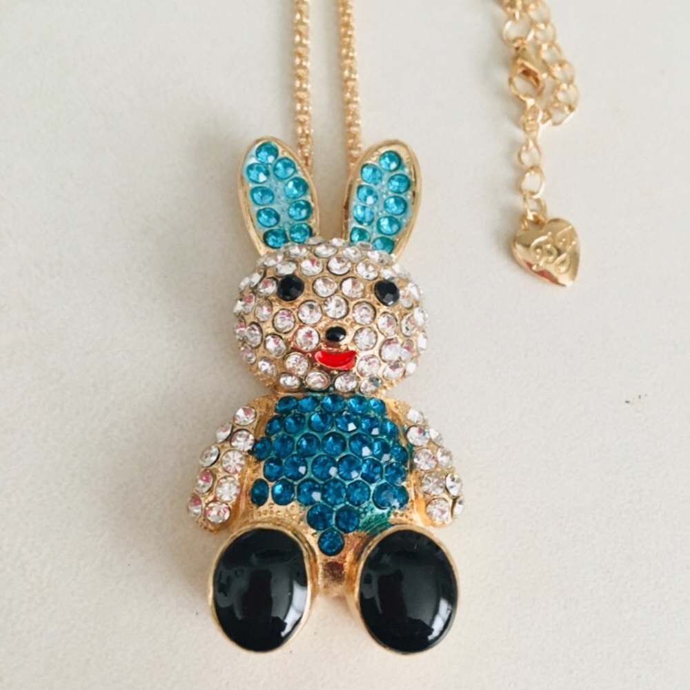 This brand new adorable necklace has a cute rhinestone/crystal studded rabbit pendant that measures 2 3/4” by 1 1/2”. The necklace is gold plated and measures 27” long.