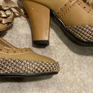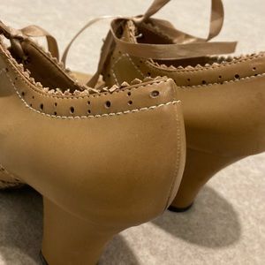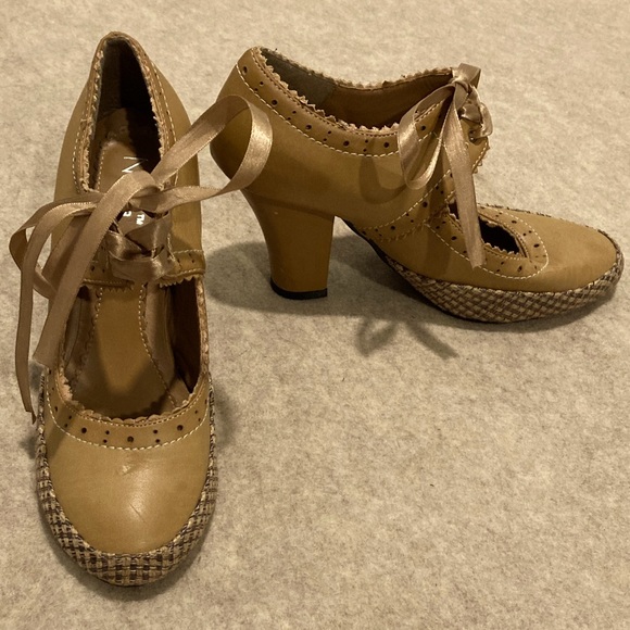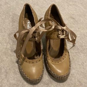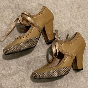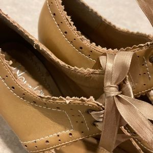 Novela heels with ribbon ties. 2.5 inch high heel. Normal wear and the scalloped edges are falling off as seen in pictures but still functional shoes