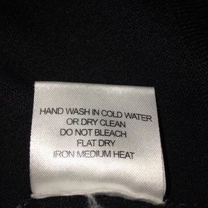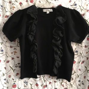 Cute little black sweater, short sleeves, ruffles in place of buttons (no buttons). Size small, appears to run very small. Chest measurement = 32