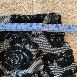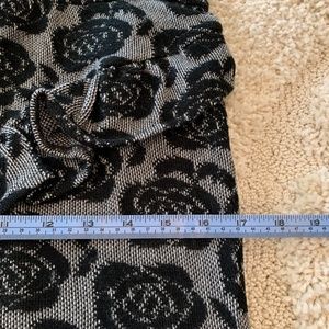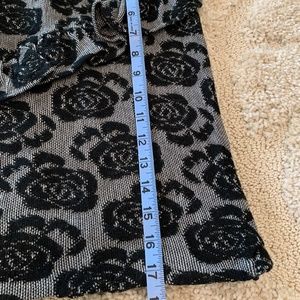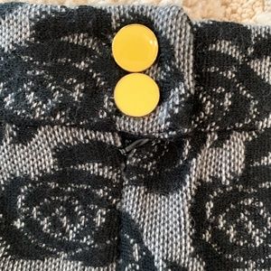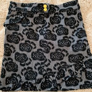Darling above-the-knee skirt by Charley and Robin from Anthropologie. Grey and black rose-print. Diagonal ruffle. Neon yellow buttons and back zip. Has some stretch. So cute!