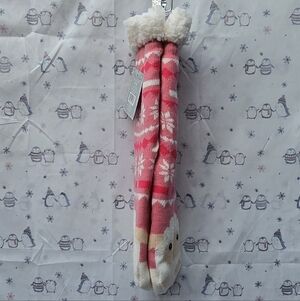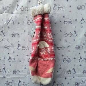 Cozy pink and white sock with winter patterns and a cute animal design.