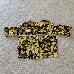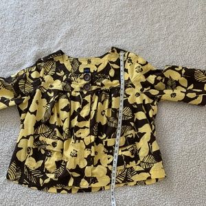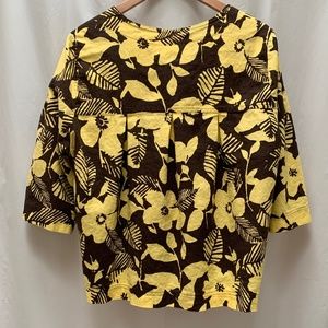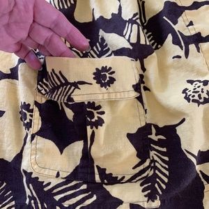 Cute tropical print jacket. 2 large buttons at the top, then the jacket is open. 2 pockets, 3/4 sleeve's.,scoop neckline. Jacket has pleats which make it drape nicely when worn.There is also a spare button sewn inside. 55% linen, 45% cotton, machine wash. Great looking jacket to wear over a dress, or skirt, and looks very nice with pants or shorts too. Excellent pre-loved condition!