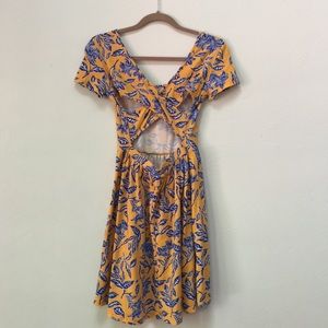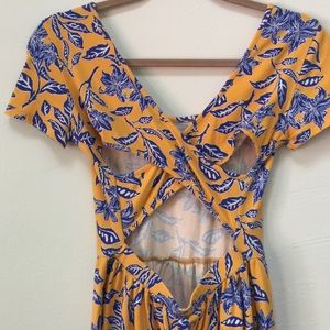 I love this dress. So comfy and cute! It's a Forever 21 skater style dress with a unique blue and yellow flower pattern and a cris-cross back cut out. Perfect for a casual outing!