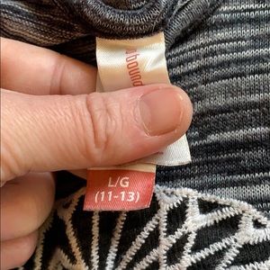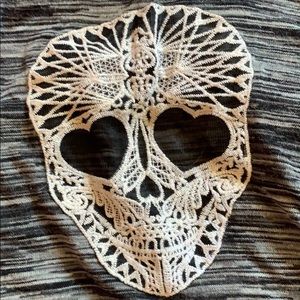 Gray stripes, cute heart shaped eyes in the stitching of the skull, very comfortable fabric, only worn about four times, good condition, no stains or tears.