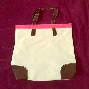 This bag is perfect for this upcoming Spring! It is white with brown handles and a hot pink border at the top. Inside is a bright orange. Very spacious! Comes with a large hot pink change purse!