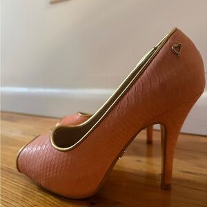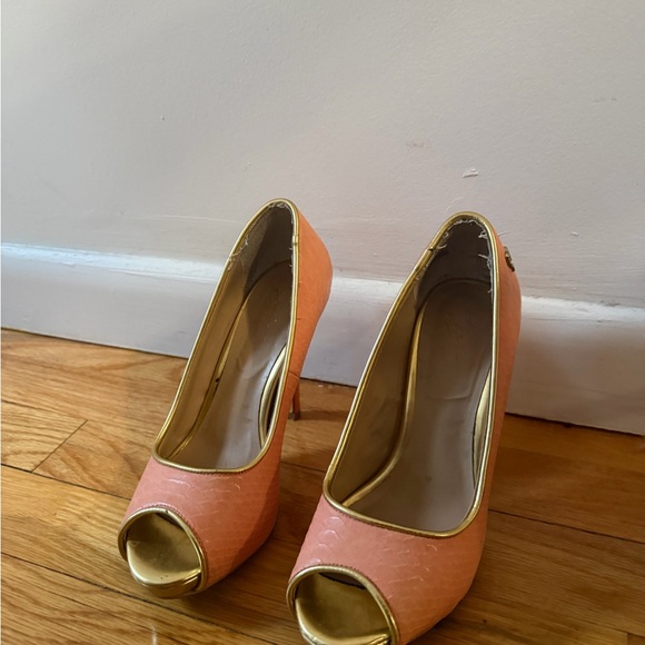 peep-toe heels in pink and gold. Perfect for stylish outings.