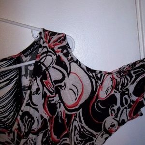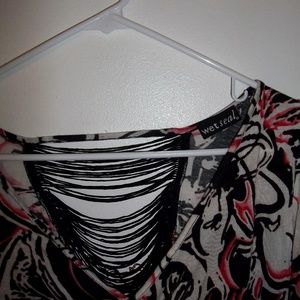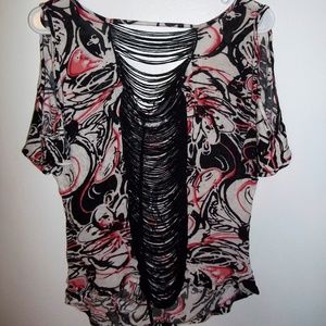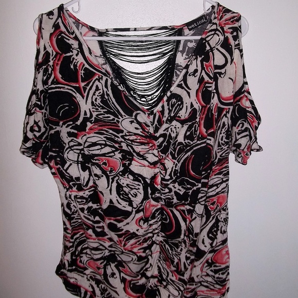 The front has a bunched line running down the center and the back center is see-through and attached by a series of thick strings. Lightly worn. XL but wears like a M or L.
