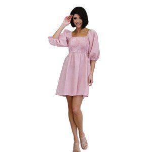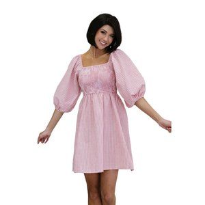 Your heart will truly skip a beat when you put this precious dress on. It has a stretchy, smocked bust with otherwise structured woven fabric in a cotton/poly blend. The subtle vertical striped and balloon sleeves add some sophistication to this flirty feminine frock 💗