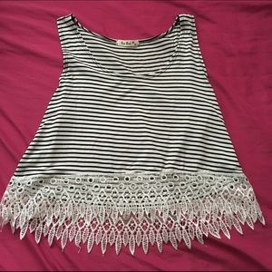 Black and white striped tank top with lace bottom. Size small but fits a medium, and it is kind of cropped because you can see your belly button a little bit through the lace, super cute!