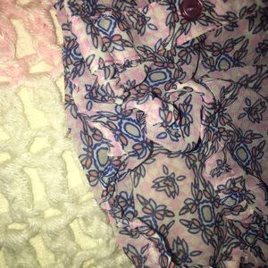 Buttoned down. Ruffles on the bottom to cuff. Very comfortable and silky. No damages. Never worn, brand new.