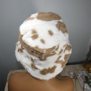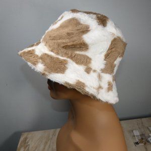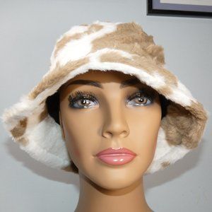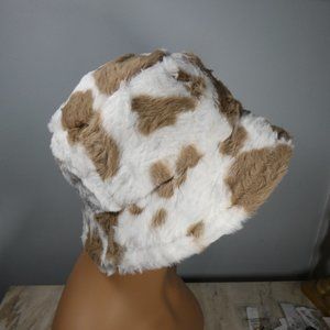 Cute! Stylish SOFT Warm Faux Fur Print Bucket Hat White with Brown Cow Pattern