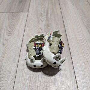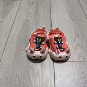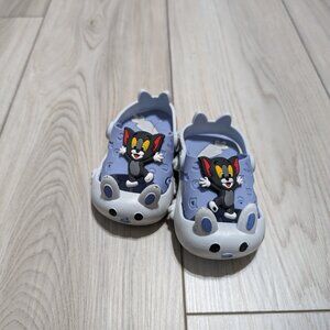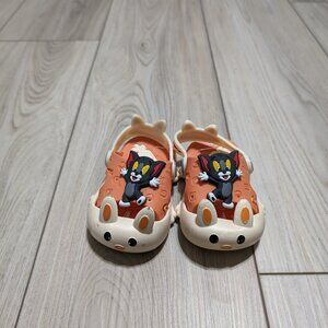 These are unisex slingback clog shoes for kids, suitable for indoor and outdoor activities like walking, beach, travel, and casual wear. They are slip-on sandals made of synthetic material with a rubber outsole and moderate cushioning. The shoes have a closed toe, flat heel, and slingback accent. They come in a solid pattern and are available in US shoe size 18/20/22. The shoes are breathable and have a synthetic lining and insole. They feature Tom, a cartoon character, and are suitable for both boys and girls.