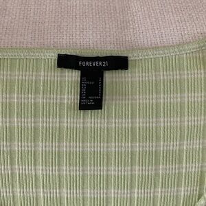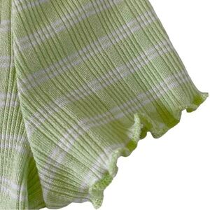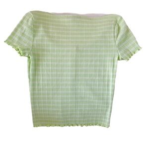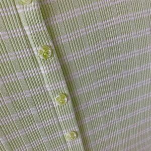 Lime, green and white T-shirt, textured with button down front and curly at sleeve and hem.