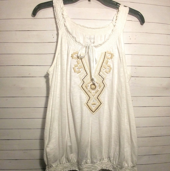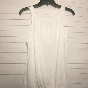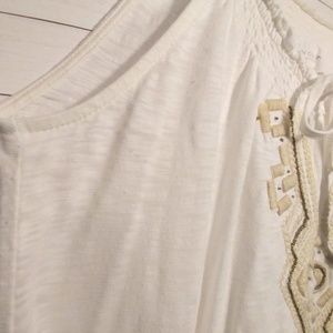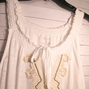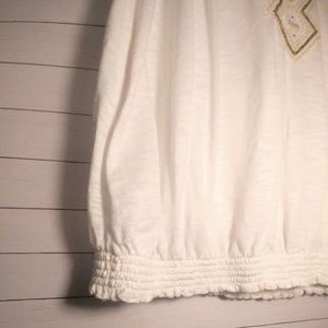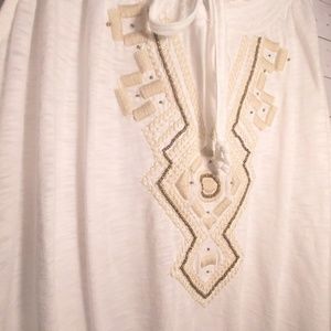 Embroidered & beaded soft white tank that has loose, soft elastic gathering around neckline and bottom. Worn once. No pilings, NWOT, no stains.