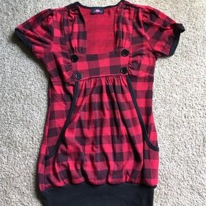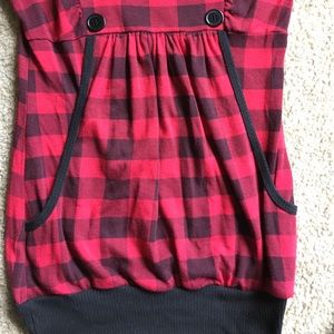Red and black tunic top. Size tag missing but this is a size Large with some stretch to it. The second pic shows that there are pockets in the front of top. Adorable and comfortable. 🌷