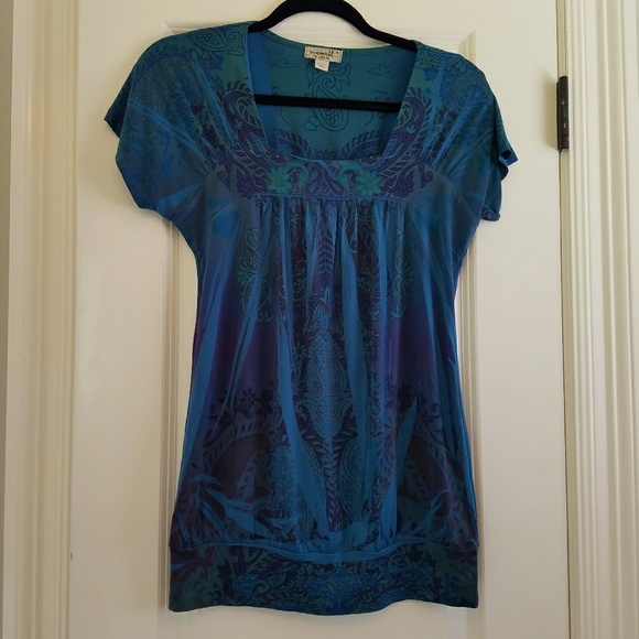 Cut blue top with purples and greens. Silky feeling. Very flattering.