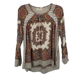 Cute floral blue brown creams. Front tie with lace inserts on front. Size S, but is oversized I feel. I am listing measurements below. Approximate measurements are pit to pit 21". Length is approximately 26", but it has hi-low hem, where it is longer in the back.Sleeves are approximately 26". Good condition.