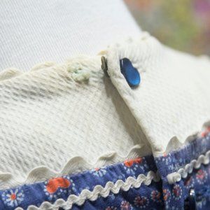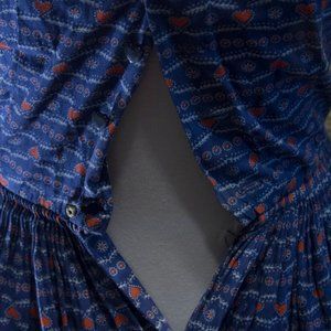 Adorable 1950s blue day dress with heart pattern. Size XS, waist is approx 23"-24", bust 33"-34". In good vintage condition for its age, with light wear on collar and underarms. No apparent rips, stains, or pulls.