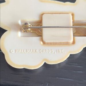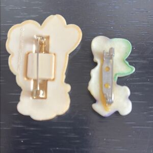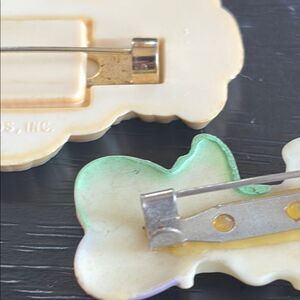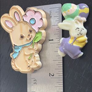 Adorable vintage bunny pins featuring a flower and and eggs. Perfect for adding charm to any outfit. The tan bunny is marked hallmark and has light brown lines and paint wear. The bunny holding eggs is unmarked and shiny. They both have the older style latch