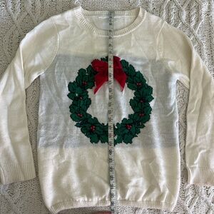 Cute White Christmas Sweater with Wreath and Holly design in white and green