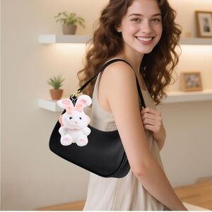 Adorable plush bunny keychain in white and pink. Features a bow and heart details.