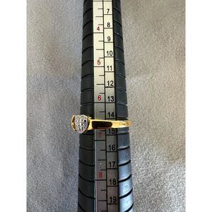 The ring pictured is a sterling silver band with 14 Kt gold overlay, With one tiny Diamond in the center.