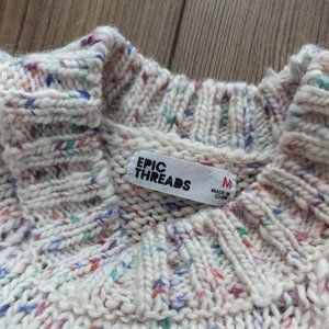 This sweater has multi-colored flecks on cream. The sweater is think and warm and a little longer than waist making it like a tunic.
