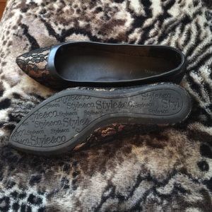 Extremely cute and classy flats. Shoes are gold with black lace. Only been worn a handful of times, and stored in my closet. I great condition.